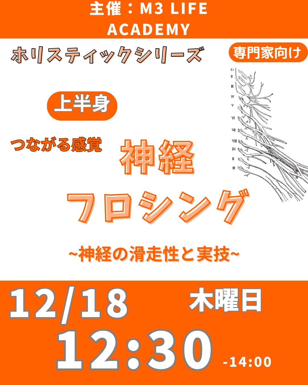 このセミナーでは、「Nerve Flossing(ナーブフロッシング)」という神経のモビライゼーションテクニックを用いて、神経系の自由な滑走を促し、動き・痛み・パフォーマンスに大きな変化をもたらす方法を学びます。